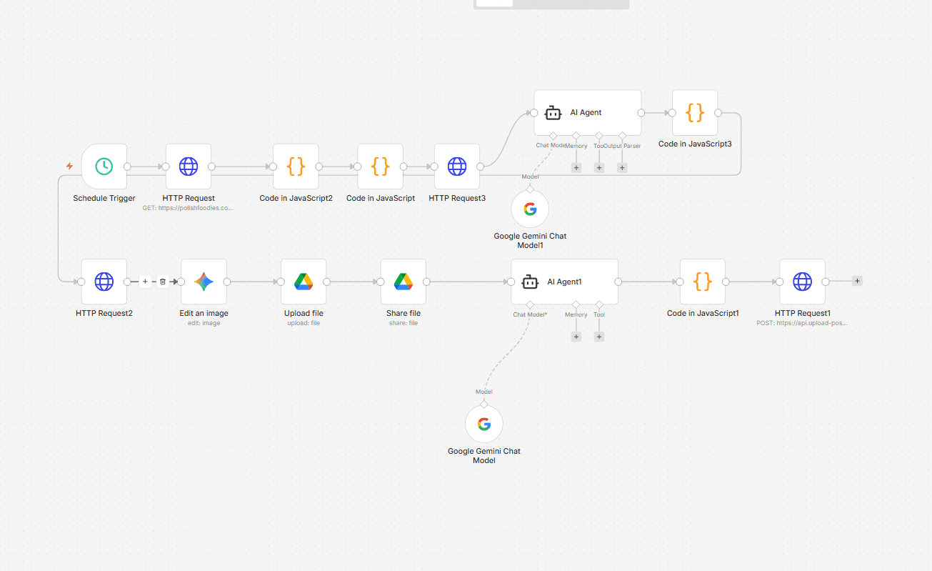 Pipeline Publikacji: Integracja z zewnętrznym API za pomocą węzła HTTP Request umożliwia finalną publikację contentu. Dane są tymczasowo składowane na Google Drive, co rozwiązuje problemy z przesyłaniem metadanych obrazów.