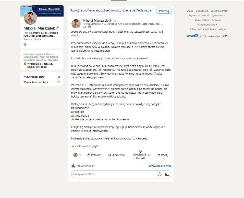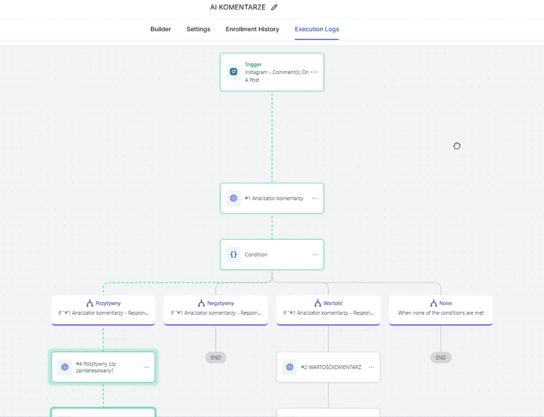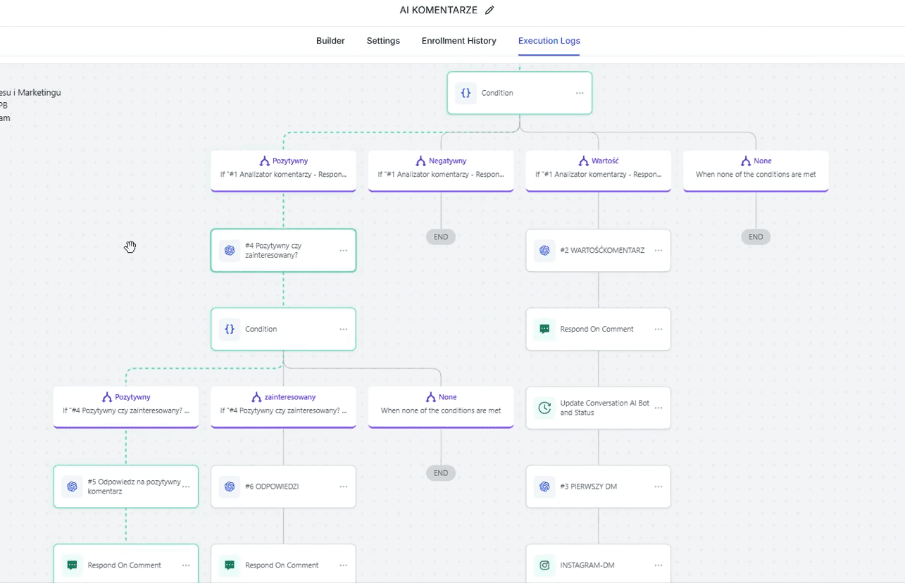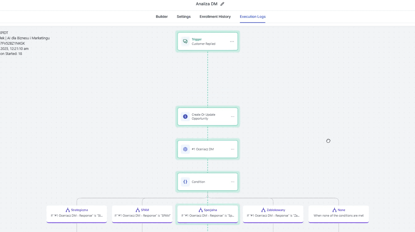 Smart DM Router (Kwalifikacja Wstępna): Centralny hub przetwarzający wiadomości przychodzące. Wykorzystuje zaawansowaną logikę warunkową do filtrowania spamu i botów oraz wykrywania słów kluczowych (Lead Magnets). System potrafi zidentyfikować sytuacje kryzysowe ("Emergency Detection"), wymagające natychmiastowego przejęcia rozmowy przez człowieka.